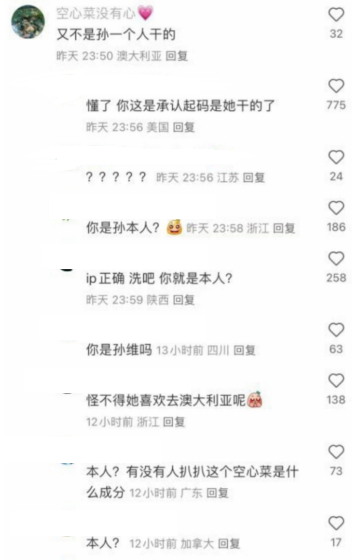 还有网友发出了一张截图,截图上面清晰可见一句回复:又不是孙一个人干的!下面网友的回复也是很统一,都在质问她是不是本人。