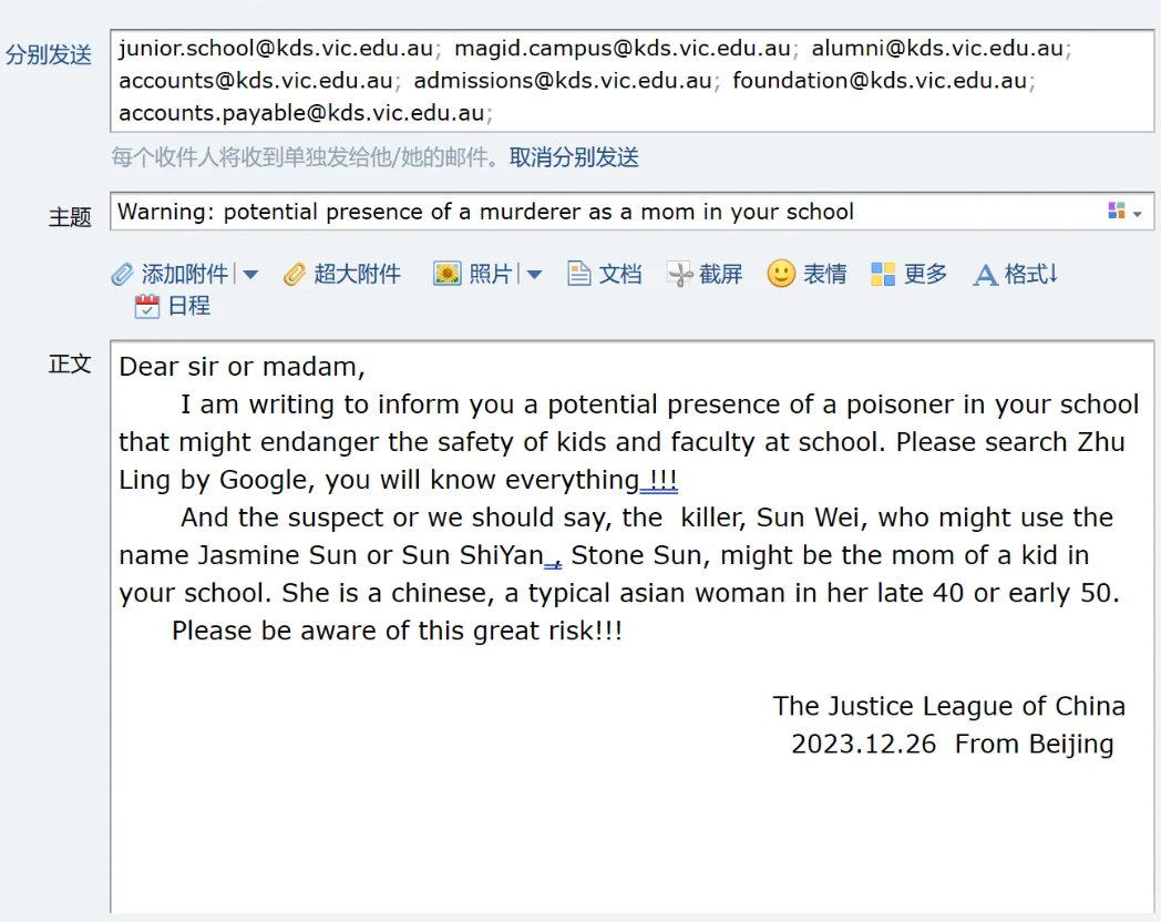 不仅如此,还有网友写信给墨尔本当地的犹太学校,表示,孙某的孩子可能遗传母亲的,或许会对学校里面一些优秀孩子的安全造成威胁。