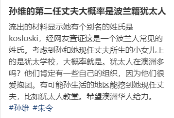 有了追踪之后,网友开始陆续曝光更多她的消息,比如说有网友表示,孙的第二任丈夫可能是波兰国籍的犹太人,是从姓氏中发现的,然后表示她和现任丈夫的小女儿上的是犹太学校,以此推断是犹太人。