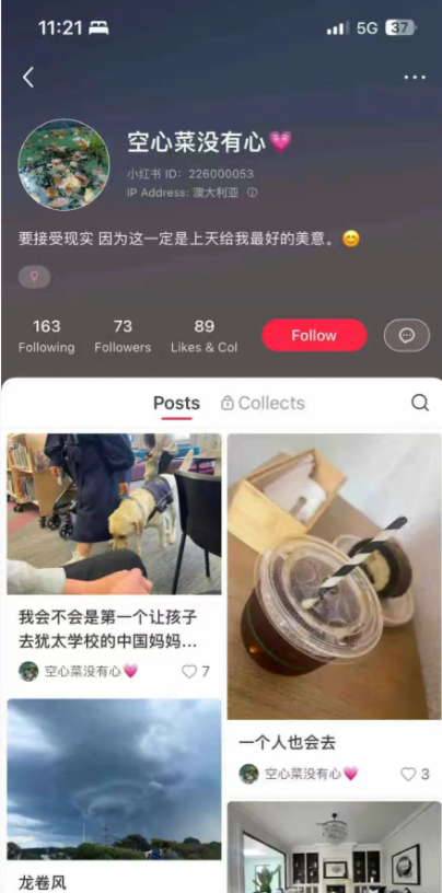 按照这个账号的ID显示,这个人的确在澳洲,而且是一家人都在澳洲生活。账号的签名是:要接受现实,因为这一定是上天给我最好的美意。