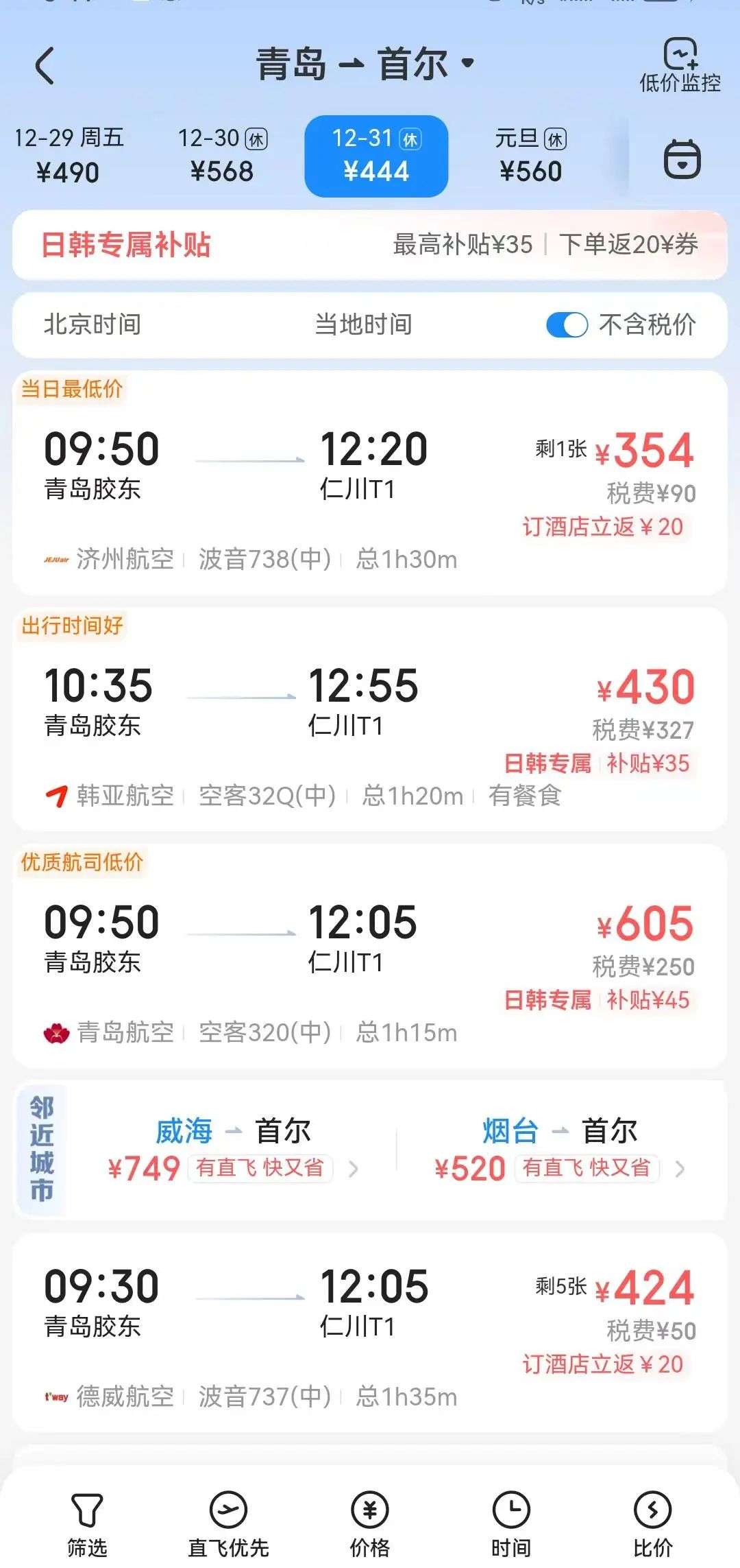 廉价的机票,更给倒爷们锦上添花。以青岛为例,作为中国往返韩国航班最密集的城市之一,青岛目前每天大约有25次航班直飞首尔,飞行全程约一个半小时,票价更是低至三四百元。