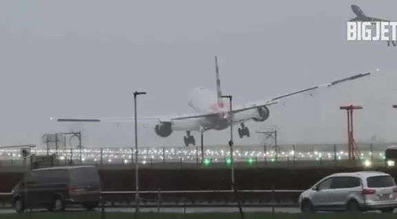 从视频也可以看到,飞机轮子接近地面的时候,被风吹得弹跳起来,机头也被弹起。