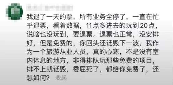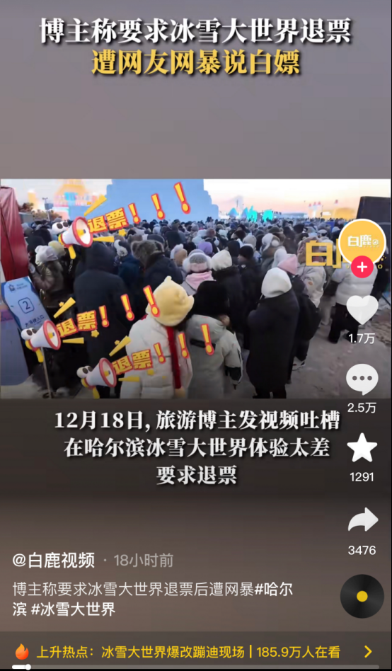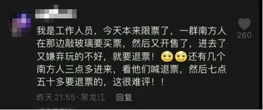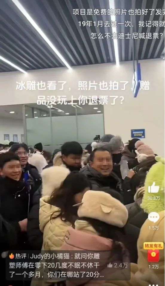 而他要玩的这个项目,叫“大滑梯”,这个项目是网络上的热门项目。但正因为想要玩的人太多,导致排队时间漫长,许多游客从中午一直排到下午,依然轮不到体验。冰冷的天气里,人群中有些人感到失望和不耐烦,失控地大喊:退票!而景区的反应速度也很及时。当天下午,就立刻出台公示:要优化,细化游园安排。而更令人敬佩的是,景区给他们真诚道歉,还给很大一部分游客退票了。至此,事情算是告一段落了。哈尔滨这边已经做得很到位,算是仁至义尽了。然而游客这边,很大一部分的游客,主打一个自私自利到底!他们的嘴脸到底有多恶心呢?“拍完照了,朋友圈发了,滑梯也玩了,工作人员陪着到12点,最后我要他们给我把全款退了。”???这一声“感谢东北老铁”,说完以后你的良心不会痛吗?“早点去拍照,多玩项目,然后全款退票,主打白嫖,感谢东北老铁,明年再来退票。”?????特么的,今年免费玩了项目,明年还想来白嫖?甚至有人拿到钱了得意洋洋,还在网上发攻略,教别人怎么退票。就……怎么说呢,你这不但是要薅羊毛,还打算把羊给宰了。有人退完票了还赖着不走,继续把该玩的项目玩了个遍。更有一些无耻的人,别有用心想要黑哈尔滨,就在网上征集“哈尔滨失望之旅”的文案,要人拍点破旧的街道,借此搞臭哈尔滨的名声。有工作人员透露,本来限票了,结果一群人又在敲玻璃要买票,结果开售了之后嫌弃不好,直接要退票。这就相当于,你上饭店,人家本来不营业了,你非敲玻璃要人家开门,最后吃饱喝足后打着饱嗝,说这菜不好吃,要求退钱。还有的工作人员说,冰雪大世界里又不是没有休息的地方,但他们就是不去,非得要挤到大滑梯这里排队。大滑梯是免费项目,用脚趾头想都知道人多,结果呢?他们玩不上就大肆诋毁,嚷嚷着要退票。人家早就说了,哈尔滨冰雪世界的预约人数高达4万,提醒你们要做好相关的准备,来之前不做攻略的吗?出来旅游没有一点心理预期?去迪士尼,在酷暑中排队5小时屁都不敢吱一声,遇到对方搜包入园这种操作二话不说,乖乖上交。对外资企业无限包容,到了我们国家自己搞的非遗冰雕项目就严苛得不行,恨不得要砸了人家的饭碗。这是典型的窝里横!这一次退票风波,除了很少一部分人的确是在寒风中等得不耐烦,怒而退票之外,还有更大一部分人,是跟着起哄的白嫖党!他们面带笑容,大喊着退票,喊到最后,人群中甚至发出一阵阵哄笑。也许,他们根本没有排队,没有挨冻,只是看到有利可图,就赶紧来起哄,顺便捞一波。景区的名声被他们搞臭了有什么关系?他们玩完拍拍屁股走人。有网友说,作为一个东北人,真的很失望。这就像自己在家忙乎了一大桌子菜,准备了一天的时间等着客人来吃。结果客人酒足饭饱之后,因为一道凉菜不合口味,直接把桌子给掀了。如果说薅羊毛退票的人仅仅只是自私自利,那他们接下来的骚操作简直是恶臭了。有人注意到,这次来哈尔滨旅游的游客,有很多人穿着带吊牌的羽绒服出来了。这真是无话可说了。衣服也就罢了,鞋子穿得臭烘烘的,落地都好几天了,竟然还想退?退完票又退羽绒服,合着这一趟旅行就混了张嘴,出了张车票钱?这已经不是薅羊毛了,这叫臭不要脸。这种行为跟泼皮无赖有什么区别?为什么这件事,引发了网上极大的愤怒和反感呢?因为这一次,哈尔滨人是真的受委屈了。为了接住这一波流量,让游客们来了有份好体验,哈尔滨,真的挺拼的。耗资30多亿,打造了这个冰雪世界,每年投入的时间也不过两个月。说实在的,就算游客满员,门票依然不够成本的五分之一。更何况,里面的一些网红项目,如摩天轮,大滑梯,都是免费的。厚道的东北老乡们,根本不是想赚别人的钱,而是希望有人来了,能吃好玩好,尽兴而归。你们说景区太冷,为了让游客保暖,今年还特意建了暖房;你们说人多,设施不够,今年大滑梯一下子增加了14条;你们说票价贵,可是这真的贵吗?有网友说,自己9年前来这儿的时候,门票就是300元,今年团购的票价是323元。9年的时间,涨了20几块钱,还要别人怎么样?已经三年没开张的冰雪大世界,真的挺不容易的。因为设施的特殊性,这些非遗冰雕,都是由上千名工人师傅在零下近30°的严寒中一刀刀切下来的。他们从松花江上采集冰块之后,拖到园区一刀一刀雕刻,倾尽全力,才造出了25万立方米的冰雪奇观。有一位施工人员哽咽着说:从开工到竣工我都在里面,为了赶工期,迎接游客的到来,工人们连一口热饭都吃不上。我真的很不理解,当初卖票的时候也说得很明白,免费的项目玩不上是不退票的,可是你们为什么还要这么做呢?他们手都冻僵了,身体在极度的严寒下浑身僵硬,他们也不过是我们父辈那样的年纪,但他们硬是在风雪中生生硬扛。有个医生网友说:我们科收了一个冰雪大世界的工人,肺炎感染休克没了。那些只想着去哈尔滨旅游薅羊毛的人,绝对不会想到,哈尔滨人为了招待他们,付出了什么,承担着什么。网上曾流传过这么一句话:没去东北之前,以为东北人都是黑社会。去了东北之后,才知道东北人都是活雷锋。前半句多少带了点偏见,但后半句却让人不能不认同。东北人的热心,厚道,朴实,真的是毋庸置疑。而哈尔滨这座城市的身上,更是具有浓浓的东北气质。它实在,不矫情,有忙大家一起帮,有苦自己扛。不分男女老少,不麻烦市政环卫,他们唠着嗑,就把街道扫得干干净净。这次甘肃地震,深陷舆论风