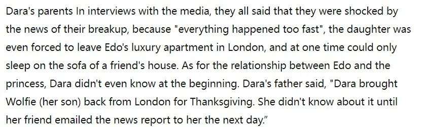 而至于Edoardo 和公主之间的关系,达拉一开始根本不知道。达拉的父亲愤愤不平的说:“达拉感恩节把儿子从伦敦带回来,直到第二天她的朋友通过电子邮件将新闻报道发给她,她才知道这件事。”