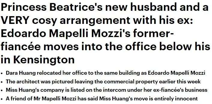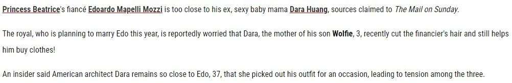 而皇室并没有直接回应,而是透过一位皇室消息人士放风:“除非比阿特丽斯公主确认Edoardo 和黄达拉的关系彻底结束了,否则她绝对不会与Edoardo 建立关系的。”