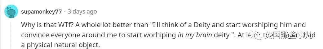“这有什么不能理解的?总比‘我想象出了一个神,然后开始崇拜他,并说服我周围的人都开始崇拜我脑子里的神’要好得多。至少村民们面对的是一个自然实物。”