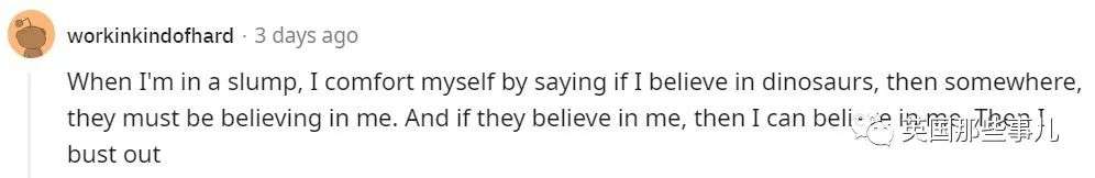 “每当情绪低落时,我会安慰自己,如果相信恐龙的力量,那它们也必定相信我。如果它们相信我,那我也可以相信我自己。然后我就会振作起来。”