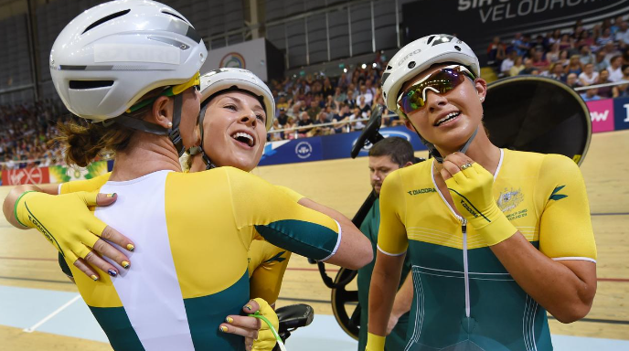 Annette Edmondson在 2014 年格拉斯哥英联邦运动会女子 10 公里中赢得金牌后,与Amy Cure和Melissa Hoskins(右)一起庆祝。