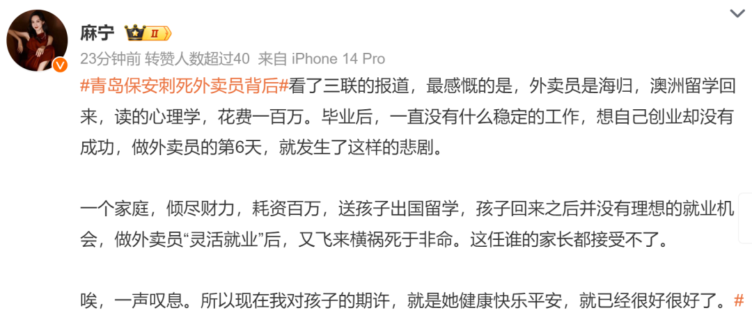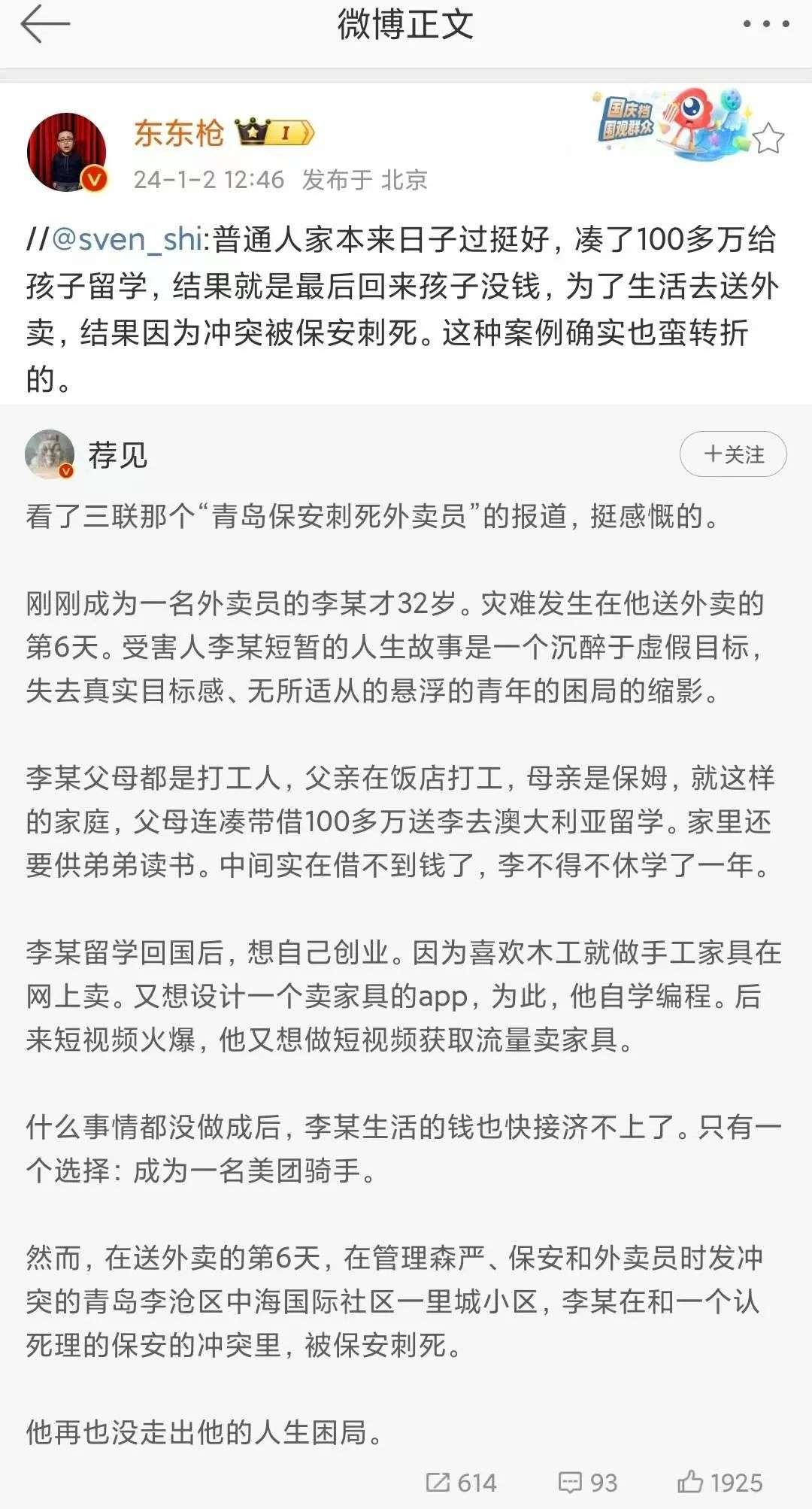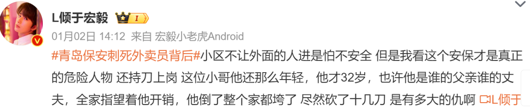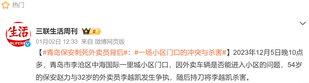 微博@荐见表示,看了三联那个“青岛保安刺死外卖员”的报道,挺感慨的。