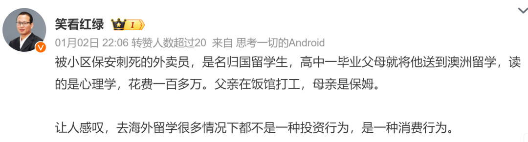 还有网友表示,这一事件让人感叹,其实去海外留学很多情况下都不是一种投资行为,而是一种消费行为。