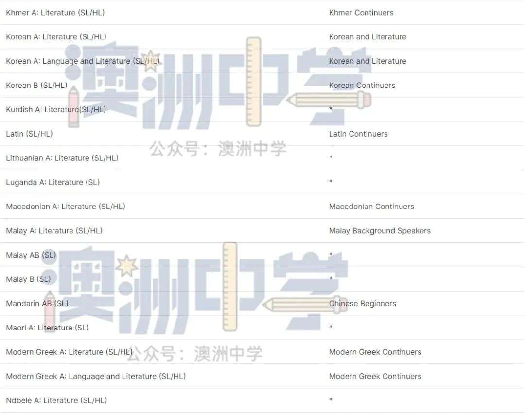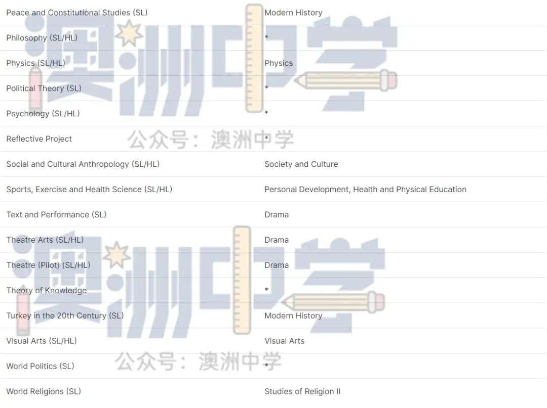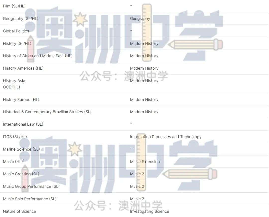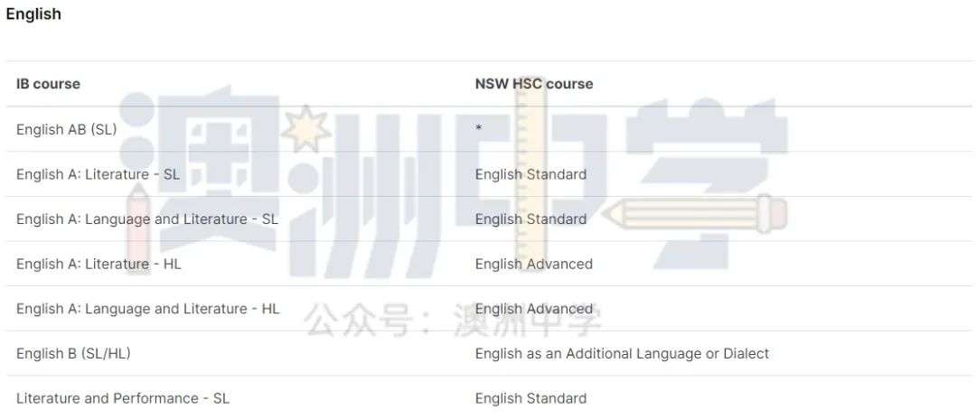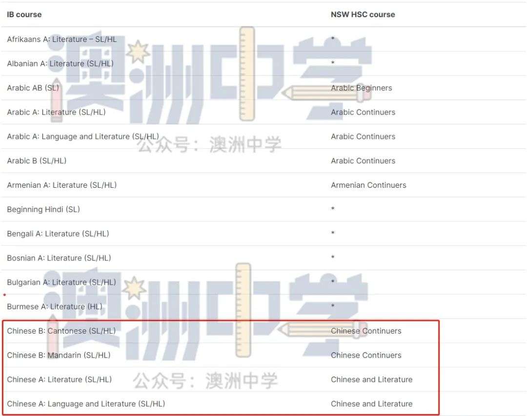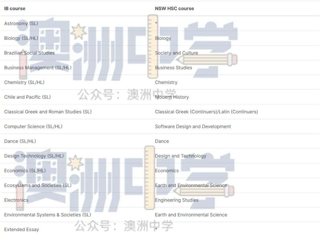 * 代表该 IB 文凭课程没有类似的新州 HSC 课程。