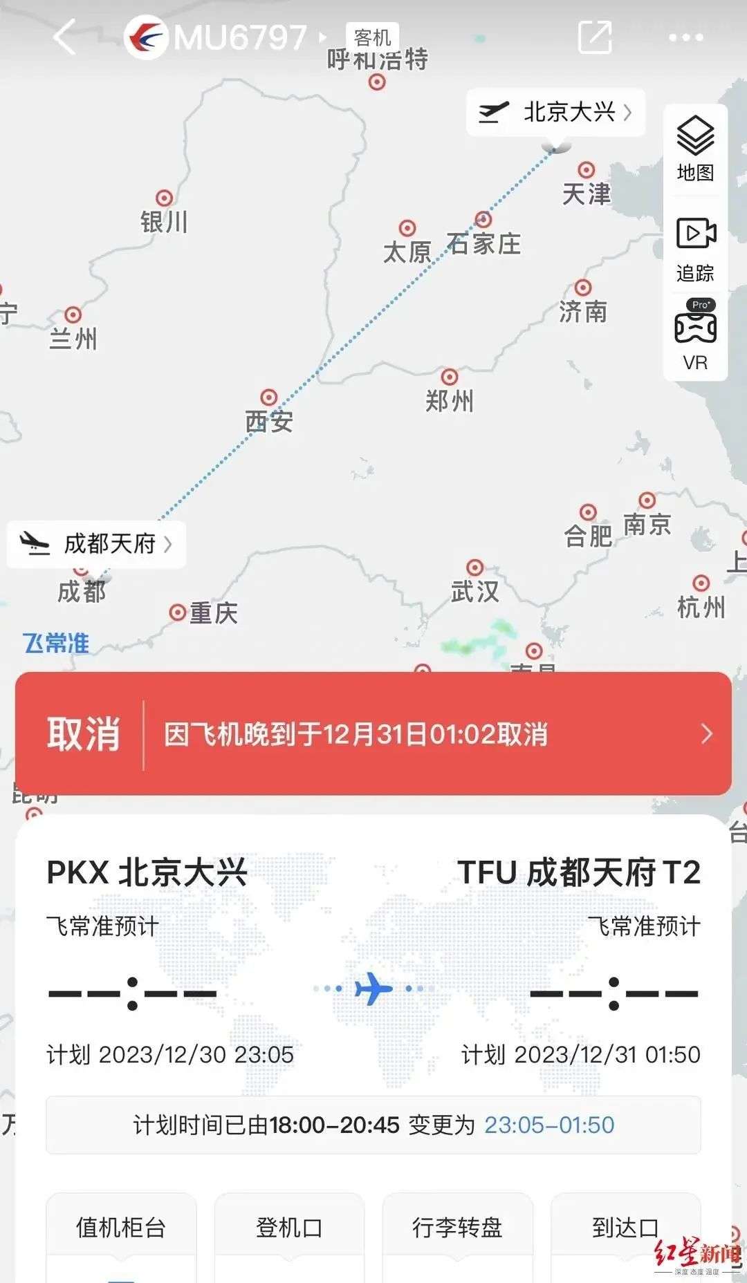 红星新闻记者了解到,事发航班为东航的MU6797。1月4日下午,记者联系上该航班的乘客孟先生。他告诉记者,该航班原本是2023年12月30日由北京飞往成都,原定于当天下午18时起飞,但飞机延误至晚上23时起飞,预计落地成都的时间为31日凌晨1时50分。