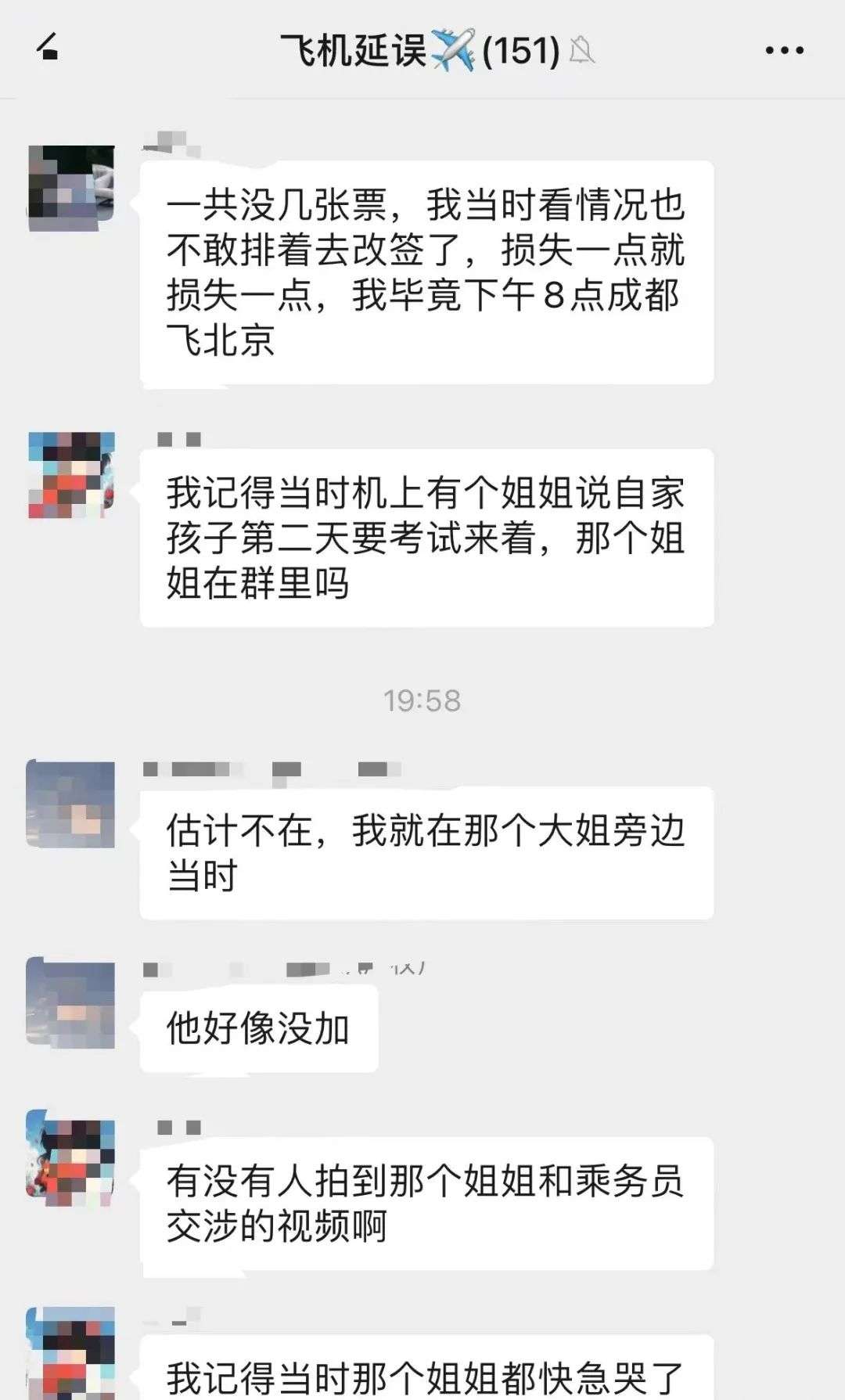 杨女士说,当时飞机上有300多人,有人订了成都的酒店、旅行团、门票、车票,是要去旅游的;有的在第二天还安排了一年一次的考试。其中一个要考试的女孩的家长在听到航班取消的消息后甚至当场哭了出来,“少则几百,多则上千,这些损失谁来负?”但孟先生和杨女士说,东航至今都没有额外提出任何补贴或补偿。后来在杨女士的发动下,飞机上的100余人建立了“飞机延误”群,共同跟进事情处理进展。在群内,多位旅客也向红星新闻记者确认了此事,并称他们正在等待东航方面的处理结果。