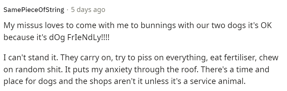 “我太太喜欢带着狗逛Bunnings,但我受不了。它们会到处撒尿,会吃化肥,看到地上有啥都吃。这让我非常焦虑。有很多地方适合狗,但五金店绝对不是其中之一,除非是导盲犬。”