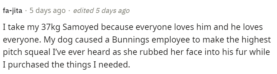 “我会带着37kg的萨摩耶去Bunnings,因为每个人都喜欢他,他也喜欢每个人。我家的狗让一位Bunnings的员工喜欢到尖叫。”