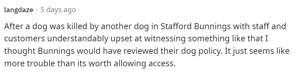 “在Stafford Bunnings发生一只狗被另一只咬死的事之后,我以为Bunnings会重新审核他们的宠物狗规定。允许狗入内只会带来更多麻烦。”