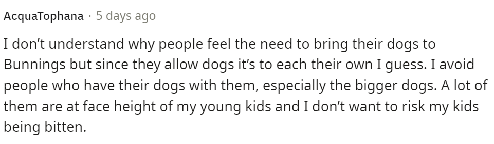 “我不能理解为什么有人会觉得有必要带着狗去Bunnings,但既然Bunnings允许带狗,这是人家的自由。但我会避开带狗的人,尤其是带着大狗的。很多大狗的身高跟我的孩子差不多,我不想冒任何我孩子可能被咬的风险。”