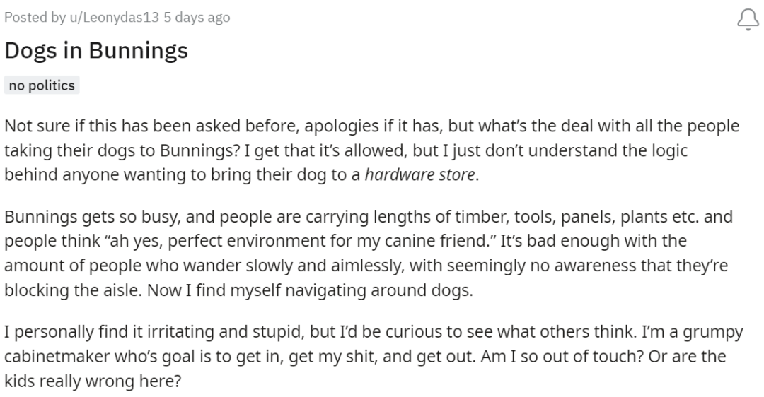 上周,澳洲一位tradie在Reddit上发帖吐槽,为啥那么多人要带着自家狗子一起去Bunnings,既不安全又影响别人。