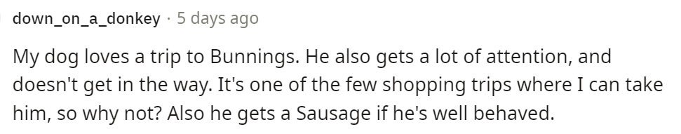 最后这位tradie还补充说,他自己也有狗,也很爱狗,带狗逛Bunnings是别人的权利,他只是不喜欢这样的做法。