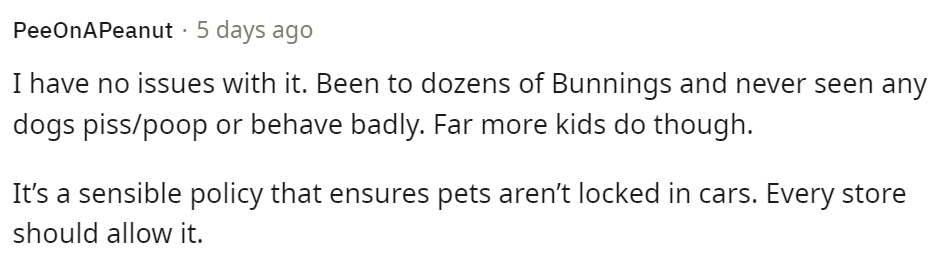 “我没有任何意见。我去过很多次Bunnings,从来没看过狗撒尿、拉屎或行为失控。倒是有很多孩子这样。