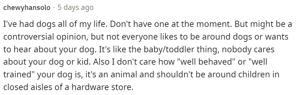 “我一直都养狗,虽然当下没有,但我想说,不是每个人都喜欢周围有狗或者听你谈论自家的狗。这就像婴儿一样,没人关心你家的狗或孩子怎么样。而且,我也不在乎你家的狗‘多么训练有素’‘多么听话’,它再听话也是动物,不应该在五金店的封闭过道内出现在孩子周围。”