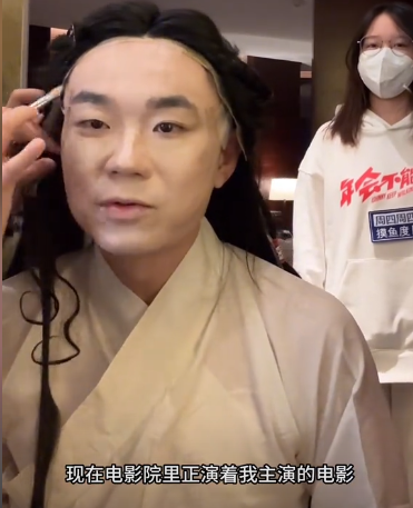 化妆前穿着《年会不能停!》的路演卫衣,像是直接从影院飞奔而来,趁化妆间隙推荐这部电影、介绍自己的角色。