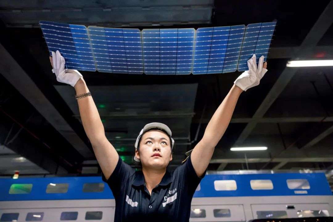 安徽合肥市一家能源科技的车间内,工人在生产太阳能光伏组件及储能设备。图/视觉中国