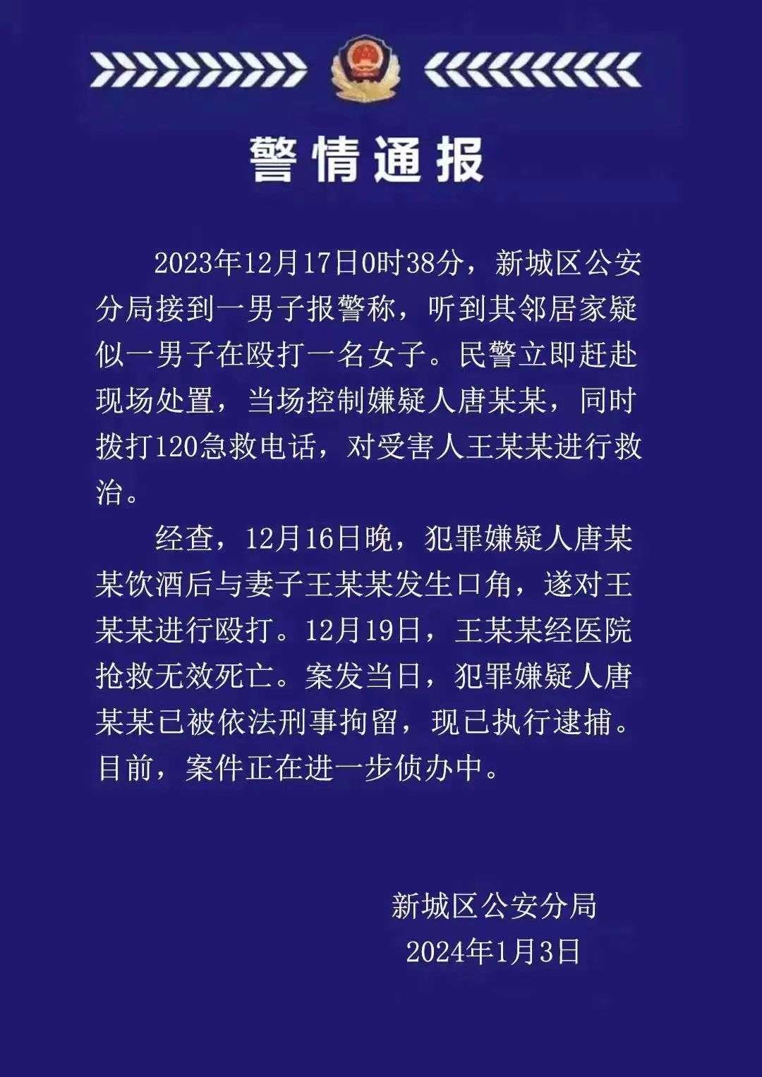 内蒙古自治区呼和浩特市土默特左旗发生的一起家暴致死案件引发广泛关注。据呼和浩特市公安局新城区分局1月3日通报:2023年12月16日晚,犯罪嫌疑人唐某某饮酒后与妻子王某某发生口角,遂对王某某进行殴打。19日,王某某经医院抢救无效死亡。案发当日,犯罪嫌疑人唐某某已被依法刑事拘留,现已执行逮捕。目前,案件正在进一步侦办中。
