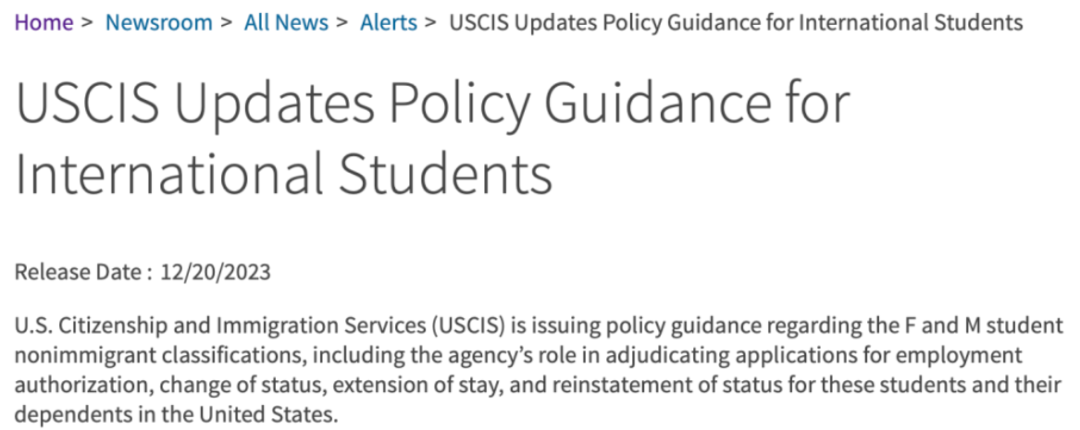 据悉,2023年12月20日,美国移民局在官网更新了留学类签证(F类和M类)政策指南: