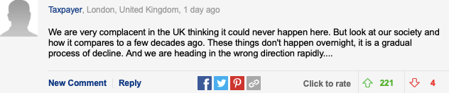 “我们在英国的人可能认为英国有一天永远不会变成这样,但看看我们的社会和几十年前的它的对比。这种事不是一夜之间发生的。这是逐步的衰败。我们都在朝向一个错误的方向快速驶去……”