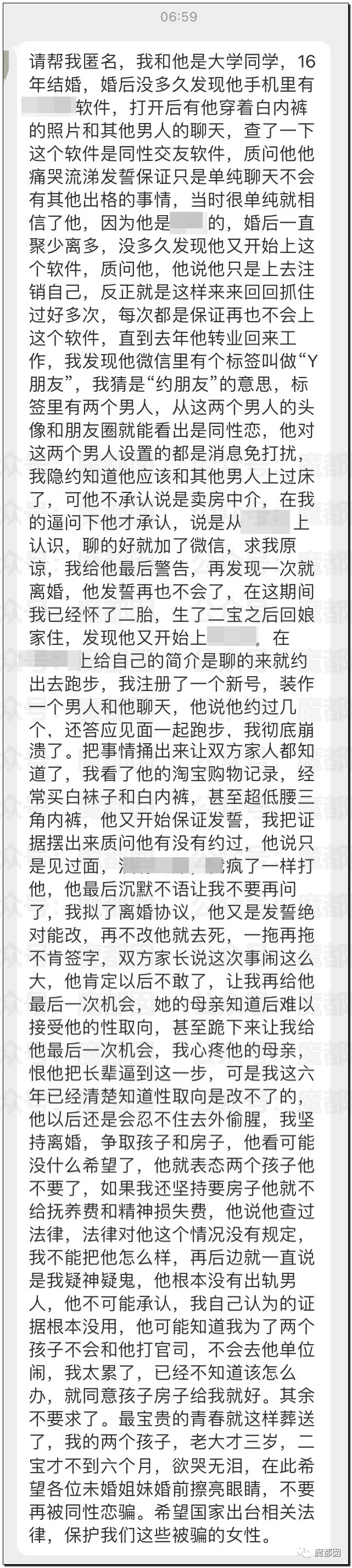 先打招呼,昨天的文章限流+和谐,很多网友在没有任何提示的情况下就不能转发就是这个原因,我们也很无奈……还有很多同学来问我们前几天写的那篇形婚的为何不能转发了,我们估计是正主来投诉了,但是因为我们都打码了而只能做到这步,嘿,偏偏我们也有倔脾气,既然那么不希望我们写,那我们今天就偏偏写一下形婚中的大家最不能忍受的骗婚案例,就是俗称的同妻。