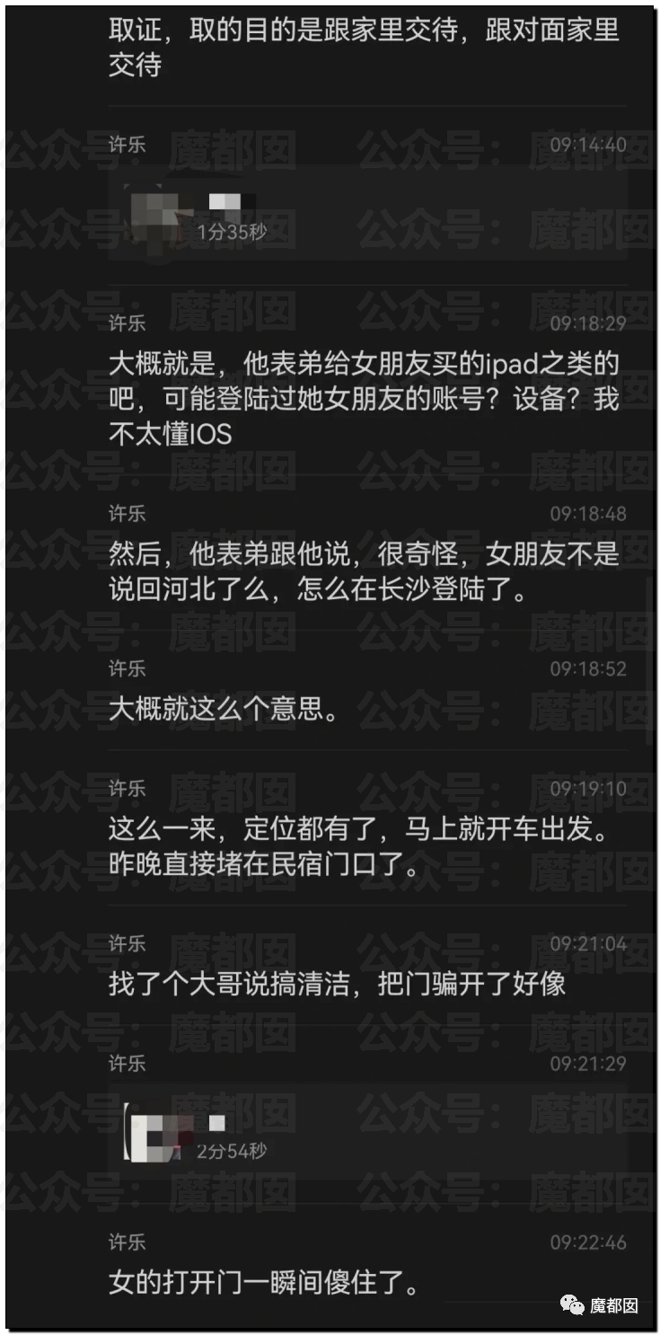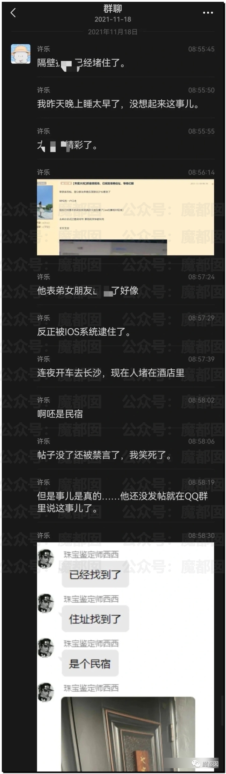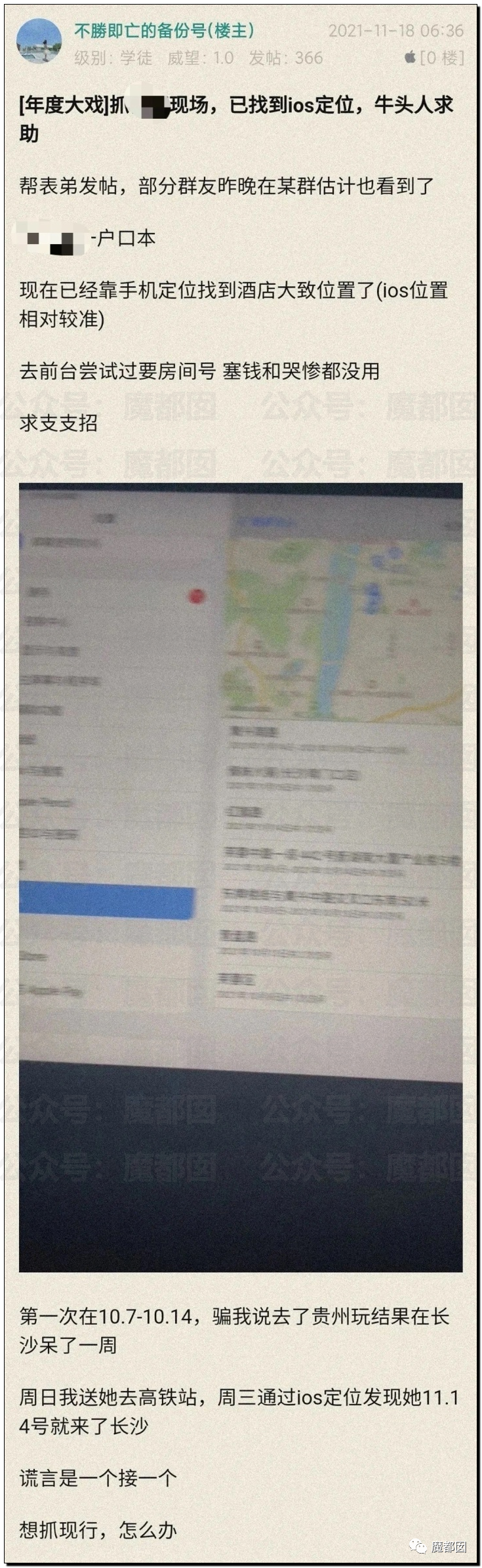 当然,这位网友不是被戴绿帽男主本人,而是他的表哥,一起帮忙去抓奸的。当然,前期两人已经有各种征兆,这个我们不提了。在一系列的怀疑下,导火索就是女主一次谎称自己去外地出差,却被男主通过iCloud发现此女在长沙某民宿好几天没动,于是长途奔赴长沙捉奸。