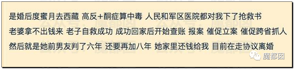 这位老哥之前婚后度蜜月的时候高原反应+酮症中毒抢救,当时的各个医院都下了抢救书,正要用钱的时候发现家里拿不出钱!好在命大的在鬼门关前走了一遭。大难不死必有后福,缓过劲来后发现自己老婆经常把家里的钱几十万几十万地转给前男友!然后就开始报案、催促立案,跨省抓人,其前妻前男友被判6年+8年总共14年,钱由前妻家里还。