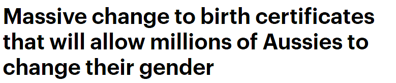 最近澳洲某地布了一项新的“自我性别认同”更改程序,方便人们修改出生证上登记的性别。