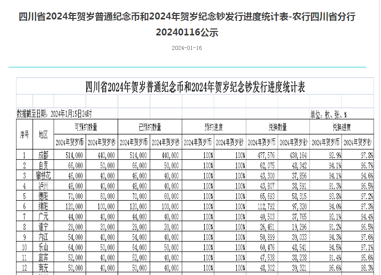在四川,截至1月14日24时,2024年贺岁币、钞的兑换进度分别为89.36%、94%,即分别剩余312807枚、146303张;截至2024年1月15日,湖南2024年贺岁币、钞的兑换进度分别为90.53%、96.44%,即分别剩余254616枚、79794张。