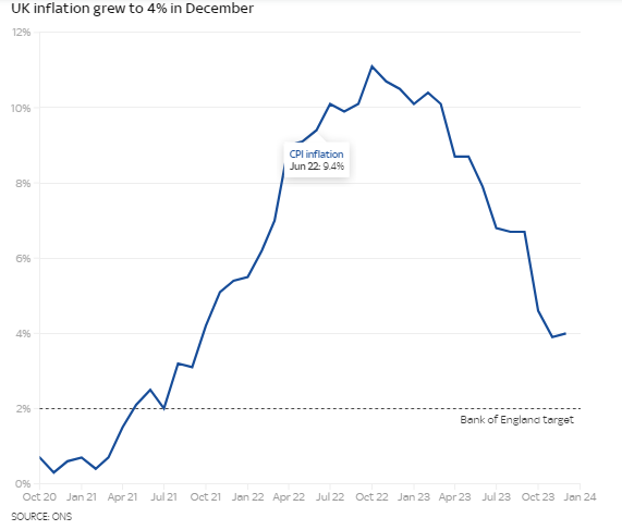 根据英国国家统计局(ONS)的数据,截至12月的一年中,通胀为4%,比截至11月的一年中3.9%上升了0.1%。