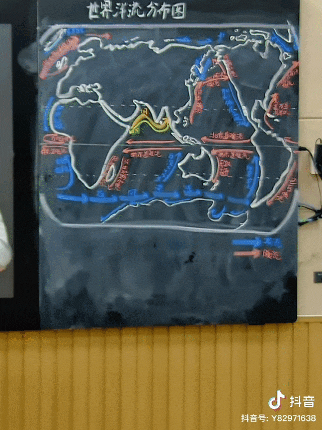 用粉笔在黑板上画世界洋流分布图、地球公转自转图。