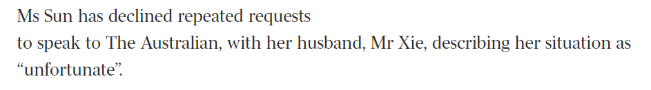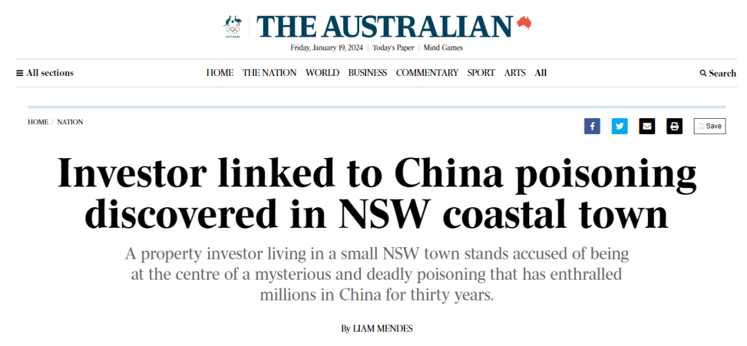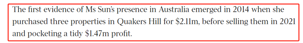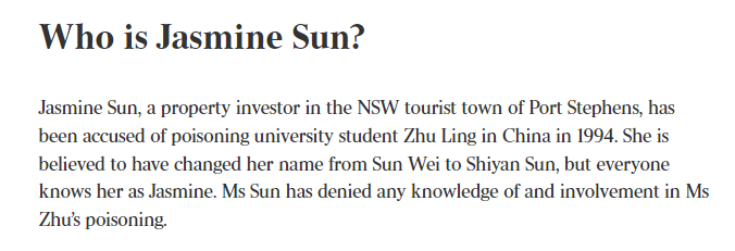 朱令案铊中毒,这件事情在去年年底被曝出以后,无数人为这位天之骄女的陨落而悲痛,同时,对下毒凶手的痛恨也达到了峰值。起初大家以为孙维生活在美国,结果被爆出,美国华人联名请愿要求将她驱逐出境,迫于舆论和生活压力,孙维离开了美国,来到了澳洲。为了不被发现,她更改了姓名甚至是年龄。结果,澳洲网友直接扒出了她在澳洲的生活细节,连社交媒体账号都被找了出来。数万华人联名,这件事情也惊动了澳洲主流媒体,The Australian开始跟进报道,多次试图采访孙维,全部遭到拒绝。于是就有了The Australian这篇头版头条文章:中国投毒案疑凶,摇身一变,成为新州房产投资人。在文章的最开篇,The Australian直接放了一张孙维的近照,从照片细节可以看出,她正在超市悠闲购物,似乎没有受到舆论的影响。同时The Australian还报道了孙维的资产情况,表示她2014年的时候以211万澳币的价格购入了位于Quaker Hill的三套房产,经过翻新装修,直到2021年才再次投入市场,这一笔投资,就让他赚了147万澳币!除了这笔投资外,她和她的丈夫feiyu Xie一直都在新州从事房产开发,房产翻修二次出售等生意。The Australian调查到的信息还显示,她在2015年还购买了一座位于新州中北海岸Booral的大型农场。可见两人身价不菲。2017年,她和全家定居新州的Port Stephens,这是一个紧邻纽卡斯尔的滨海小镇,风景绝美,也是不少人的定居首选。同时The Australian也简单回顾了朱令中毒的经过,透露了这位天之骄女从意气风发到铊中毒后痛苦不堪的经历...除了孙维现在的生活现状,生活地点,拥有至少数百万澳币资产等信息之外,The Australian的报道中还有一个首次公布的信息:孙维的丈夫接受了采访。The Australian在报道中是这样描述的:多次采访孙维本人,均遭到拒绝,但是他的丈夫Feiyu Xie却接受了采访:面对澳媒,Feiyu Xie是这样说的:“我想保护她,我认为这不是一件好事,正如你想象的那样。”当得知朱家人有很多疑问时,他说:“当然,那就发表他们的说法吧。”除了这些信息外,Feiyu Xie没有回应其他任何问题。这也是澳洲媒体首次联系到两人,虽然不是孙维本人回应,但她的丈夫发声,也能代表她本人的态度。The Australian的报道中还有一个细节:孙维改过名字,从孙维改成了Shiyan Sun。之前还有华人爆料,孙维不只是更改名字,还更改了年龄,意图与过往彻底割裂,也因为这一点,澳洲华人举报她移民材料造假。现在,相关请愿仍在进行中……
