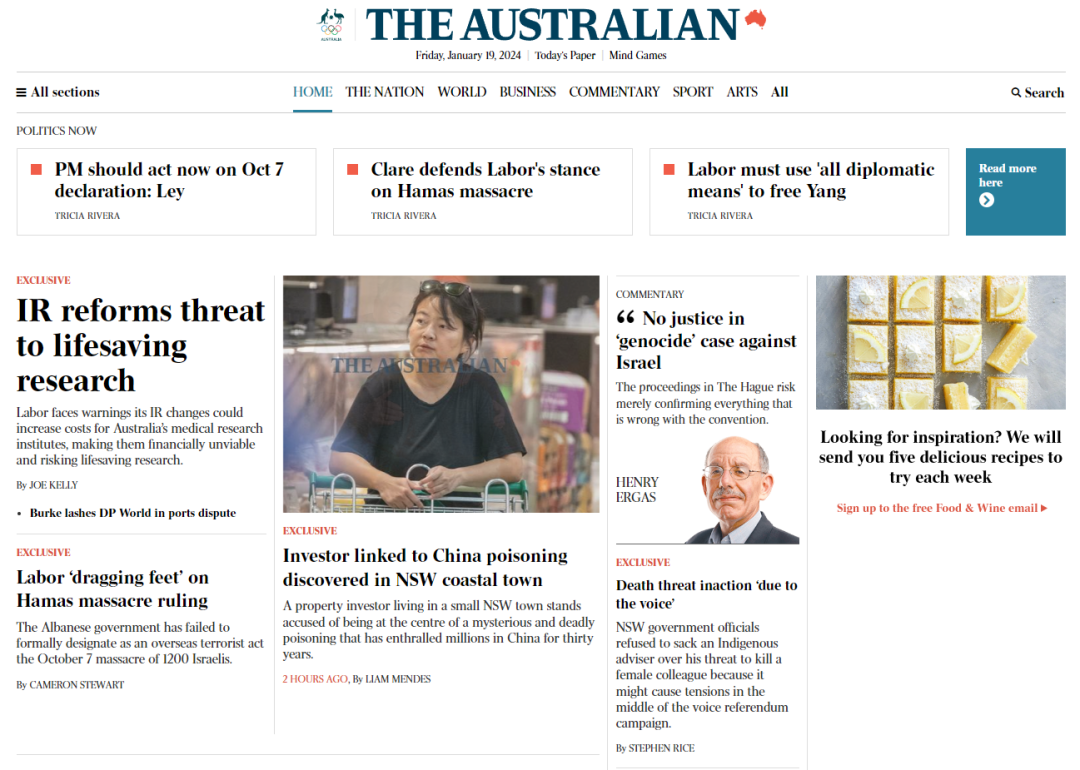 The Australian网站的首页,孙维在澳洲的新闻放在了正中心,最显眼的位置...在这份报道中,很多信息首次被披露。