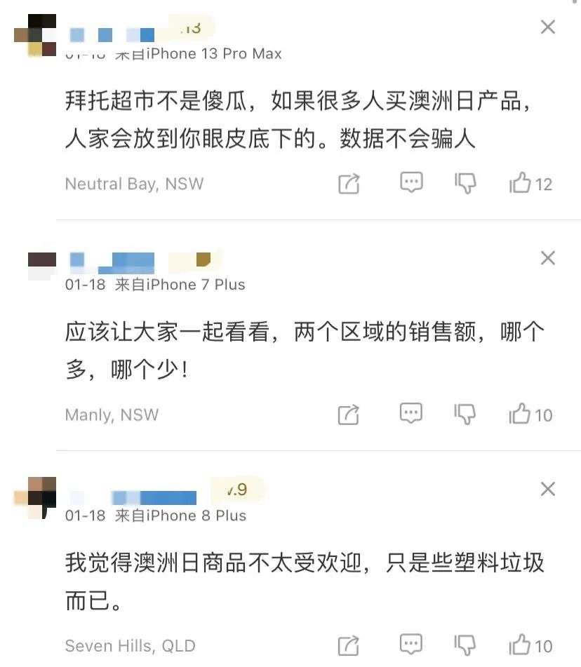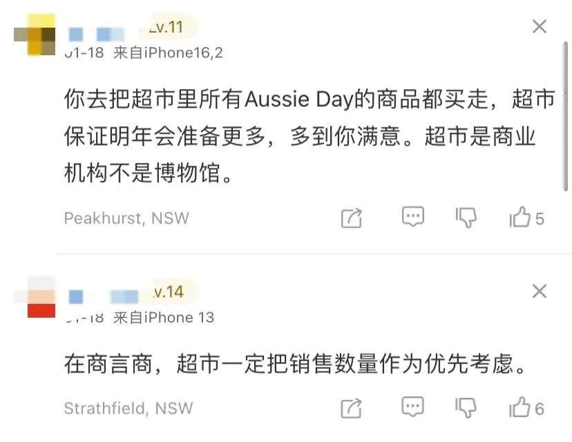 然而,一些Coles顾客表示,他们很难找到任何相关商品,或是抱怨这些商品展示被放到了商店的后面。一位Facebook用户说:“我有个问题,因为我不太跟得上时代,我上周看到一个帖子说Woolworths撤下了澳洲日相关商品。”“今天我在Pakenham的Coles也注意到没有澳洲日的相关商品展示,难道今年没有人庆祝澳洲日了吗?它真的会最终被完全取消吗?我不是想争论,只是好奇,不过这挺让人伤心的。”另一位网友称:“可悲的是,这类商品并不多,而且都在门店的后面,应该放在前面。”还有网友表示:“我也去看了澳洲日的相关商品,找不到——现在我知道该去哪里找了。”另一位则回复称:“是的,放在门店的后面,我觉得这是一种侮辱。”还有人表示:“我当地的Coles只有两个很小的货架,只是走个过场,这样他们就不会像Woolworths那样遭受抨击了。”对于Coles超市这件事,不少华人网友也表达了自己的看法: