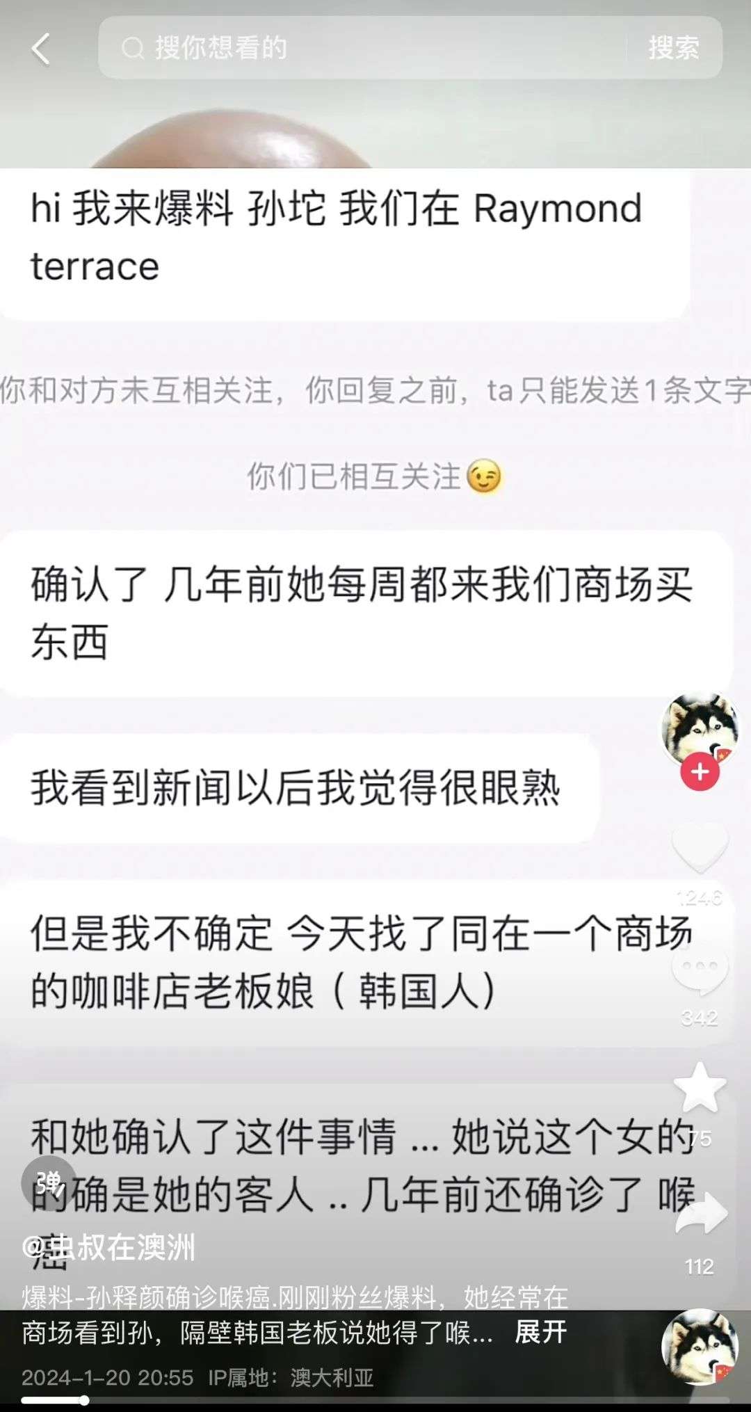 作为此件事情的发起人之一,虫叔也在最近收到了澳洲当地一间诊所的爆料,他在澳洲还分享称,他与这间诊所沟通了一下,孙维被当地居民透露称,孙本人,其实已经得了喉癌!