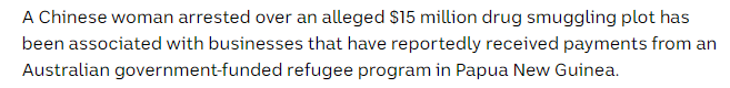 一名因涉嫌走私价值1,500万澳币毒品而被捕的中国妇女与从澳大利亚政府资助的Papua New Guinea难民计划获得补贴的企业有关联。