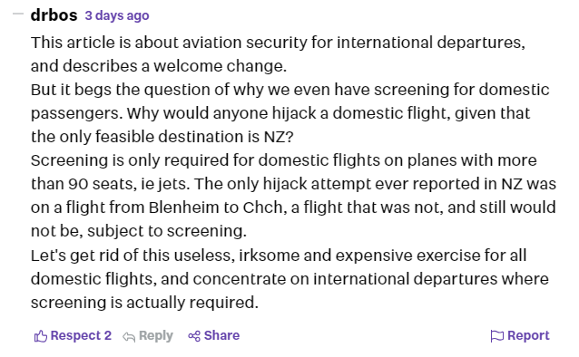 “但还有一个问题:为什么要对国内航班乘客进行安检?国内航班怎么飞都在新西兰,为什么会有人劫持国内航班呢?