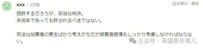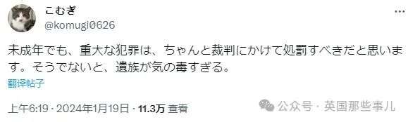 日本网友表示,即使是未成年人,犯下重大罪行的话,也应该受到法律的严惩。不然,受害者家属也太可怜了。