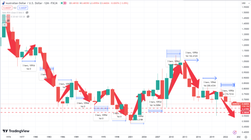 如图所示,当我们关注每四年周期内的起始与终止位置,可以较为明确地洞察澳元兑美元的波动规律。