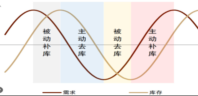 该周期大致为40个月,亦称库存周期(如下图所示),包括主动补库存、被动补库存、主动去库存及被动去库存四个阶段,体现了周期内供需波动。