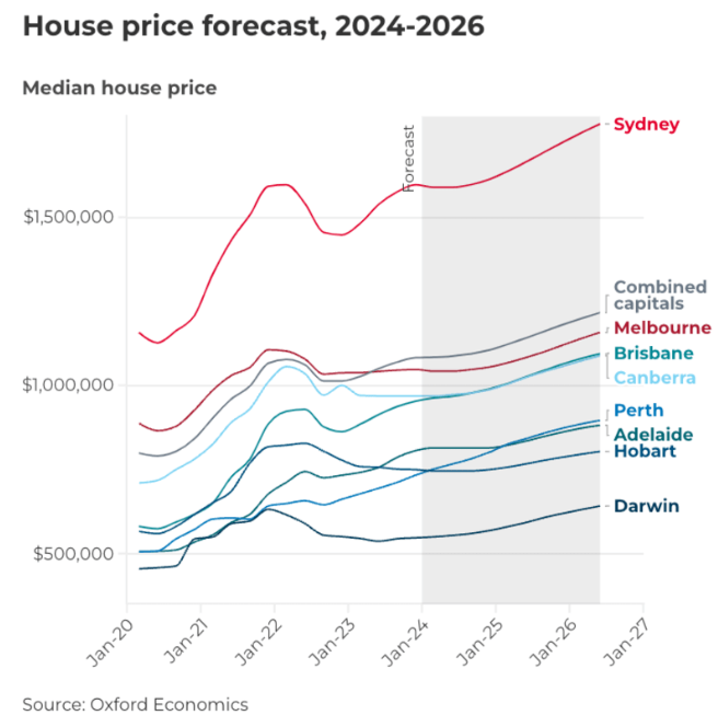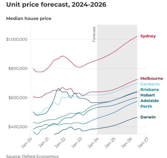牛津经济研究院高级经济学家、该报告的作者 Maree Killroy 表示,2024 年供需失衡将推动去年表现最好的城市的房价持续强劲增长。顺风将推动珀斯、布里斯班和阿德莱德的房价上涨。广告上挂牌的房源数量较少以及人们的承受能力较低,这将支撑明年这些城市的房价。