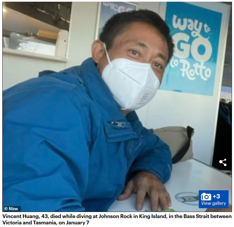 据澳媒报道,就在元旦过后没几天,43岁的华人男子Vincent Huang,在塔州King Island自由潜时不幸遇难。