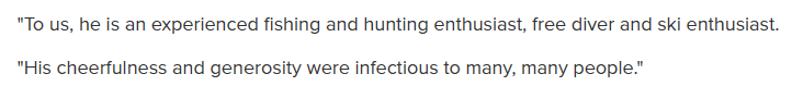 “对大多数人来说,他是墨尔本和悉尼街头知名的表演者‘气球人(Balloon Man)’,但对我们来说,他是一位经验丰富的钓鱼和狩猎爱好者、自由潜水员和滑雪爱好者,他的快乐和慷慨感染了很多很多人...”