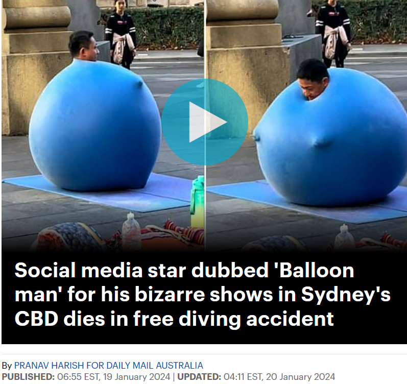 一位小红书博主就曾拍摄了Huang的街头表演视频分享到社交平台,吸引了无数人点赞和留言,并表示,“Balloon Man,这辈子给的最值的小费...刚给了一个街头表演这辈子最多的Tip,但觉得很值很开心,看完整个表演深深敬佩,每一秒都是辛苦钱,决定必须给点...”面对比平时翻了几十倍的收入,Huang很开心,但在所有人面前,他从未抱怨过自己曾经的一些悲惨遭遇,还表示自己生活在澳洲很幸福,据传,Huang靠着十分优秀的扎气球手艺,曾为谷爱凌做过皇冠造型的气球。那时候的他,或许是颇有一种“守得云开见月明”的酣畅感,但在业余时间,Huang依然像以前一样,经常去潜水、滑雪,他还是一名经验丰富的自由潜水员。就在1月7日上午11点半左右,Huang和几位友人一同去King Island西侧的Johnson Rock潜水点自由潜,没想到在水中遇到了困难...当朋友将他救出水面后,试图挽回其性命,但失败了,Huang最终不幸当场身亡。